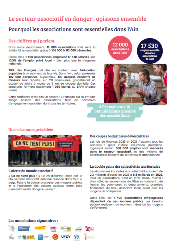 le 10 octobre de 8h à 10h, lors du Salon des maires de l'Ain, nous remettrons le plaidoyer en soutien aux associations de l'Ain aux élus du territoire, afin de les alerter sur les difficultés du secteur associatif. Ce plaidoyer, signé par plus d'une douzaine d'acteurs locaux, fait écho à l'alerte nationale sur le territoire aindinois : baisse des moyens, explosion des besoins, fragilisation du tissu associatif.